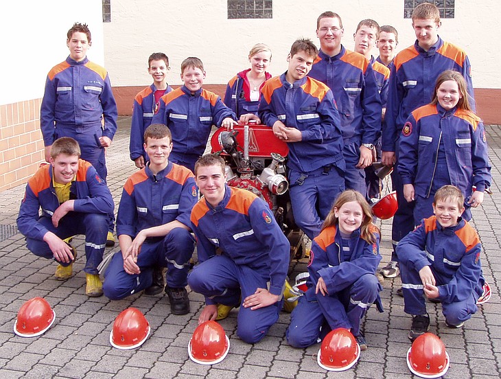Im Mai 2001 ist die Jugendfeuerwehr zum Gruppenbild vor der Fahrzeughalle angetreten. Jugendwart ist Alexander Hitz (links), seine Stellvertretern Silke Marloff (rechts).