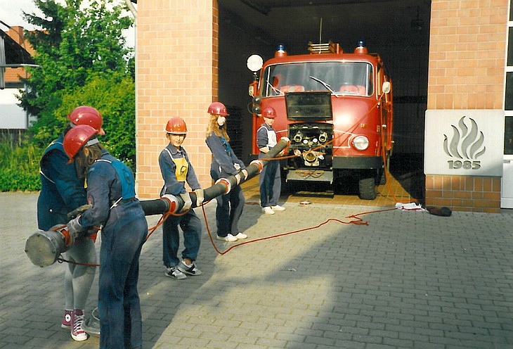 1992 üben die jüngsten Mitglieder der Jugendfeuerwehr das Kuppeln der Saugleitung noch am alten LF8-TS.